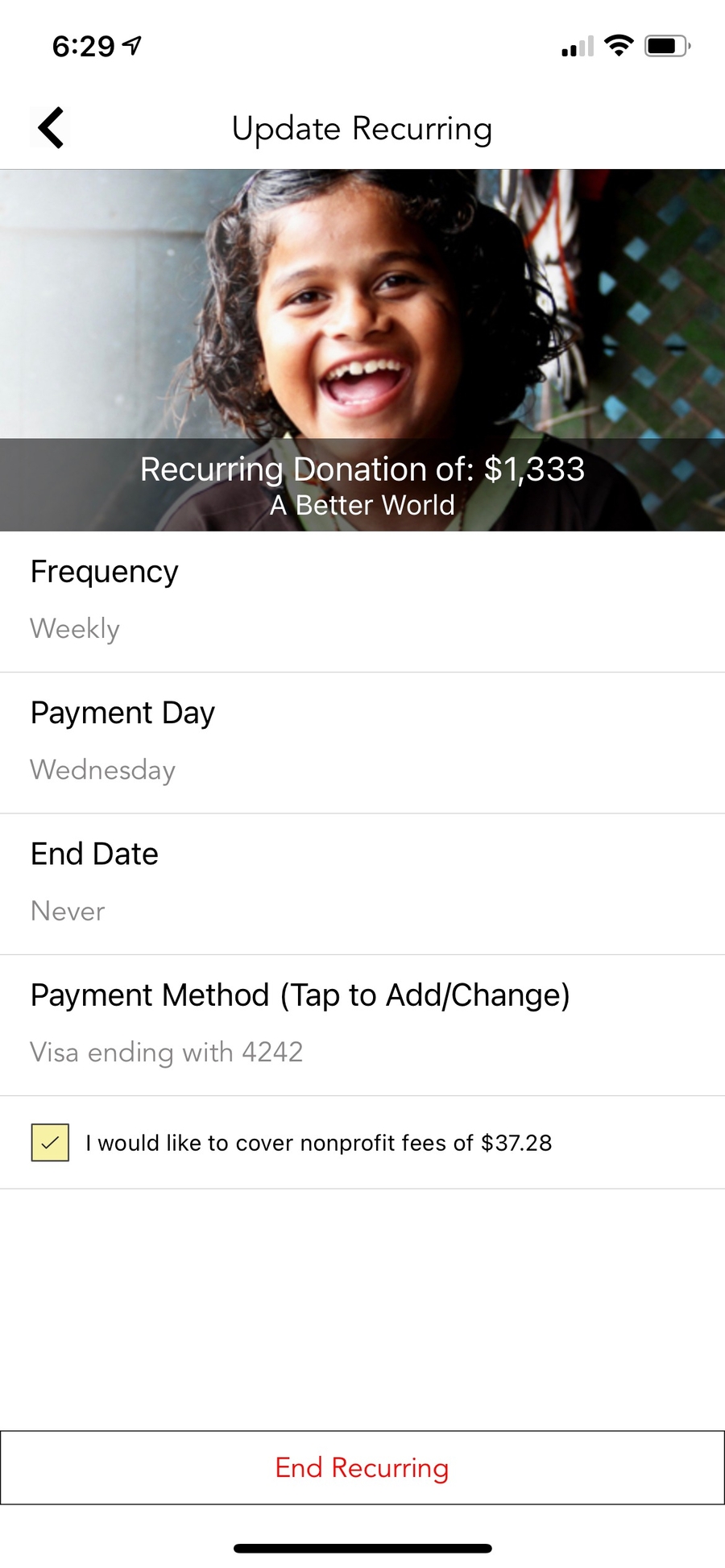 On the same page, tap on red end recurring donation to cancel it. Once ended it will no longer be charged.