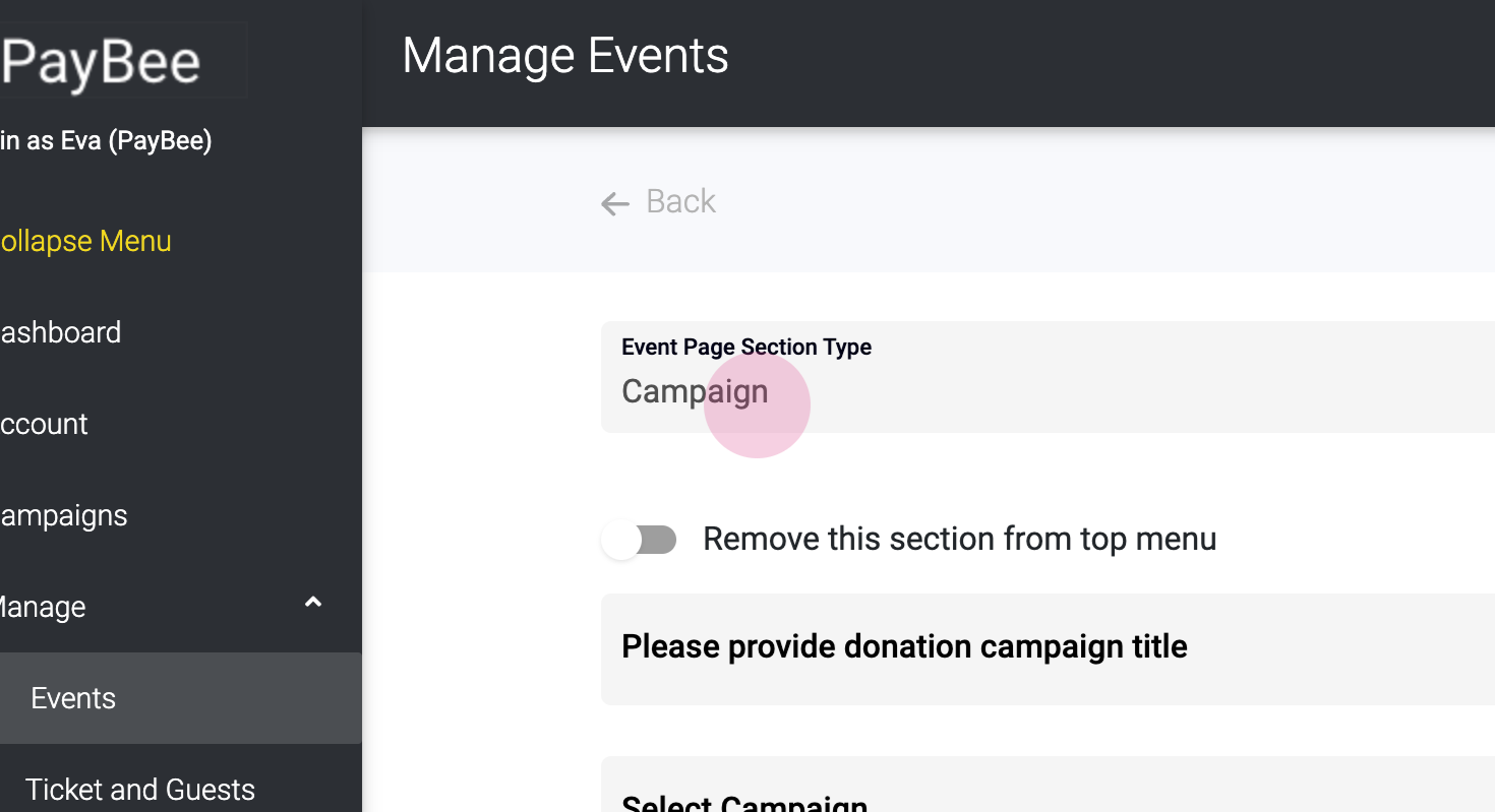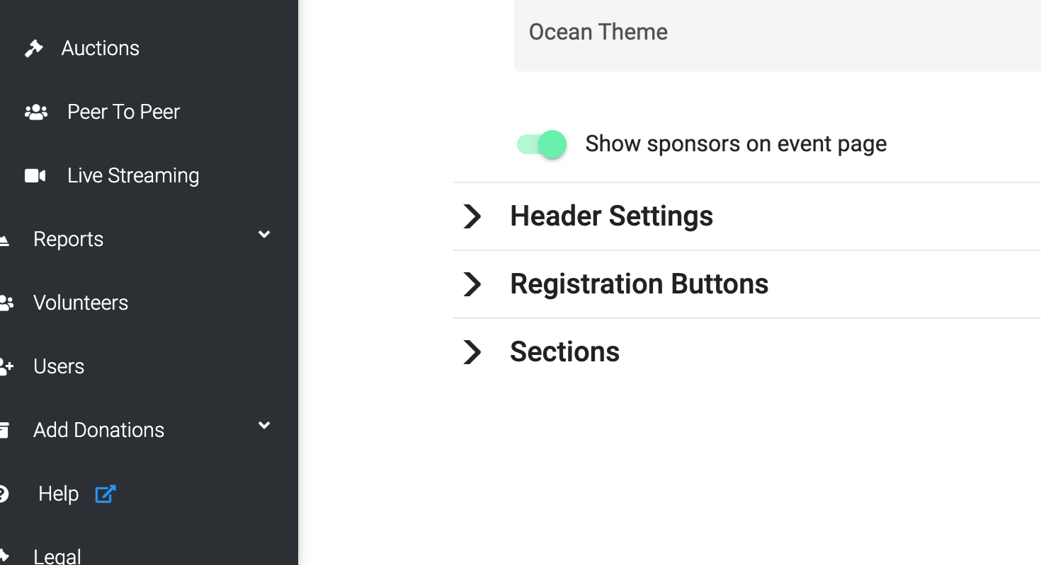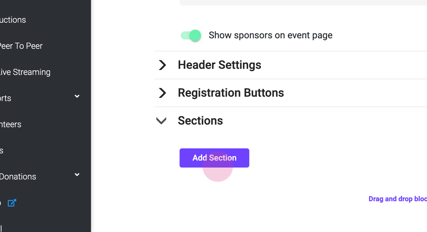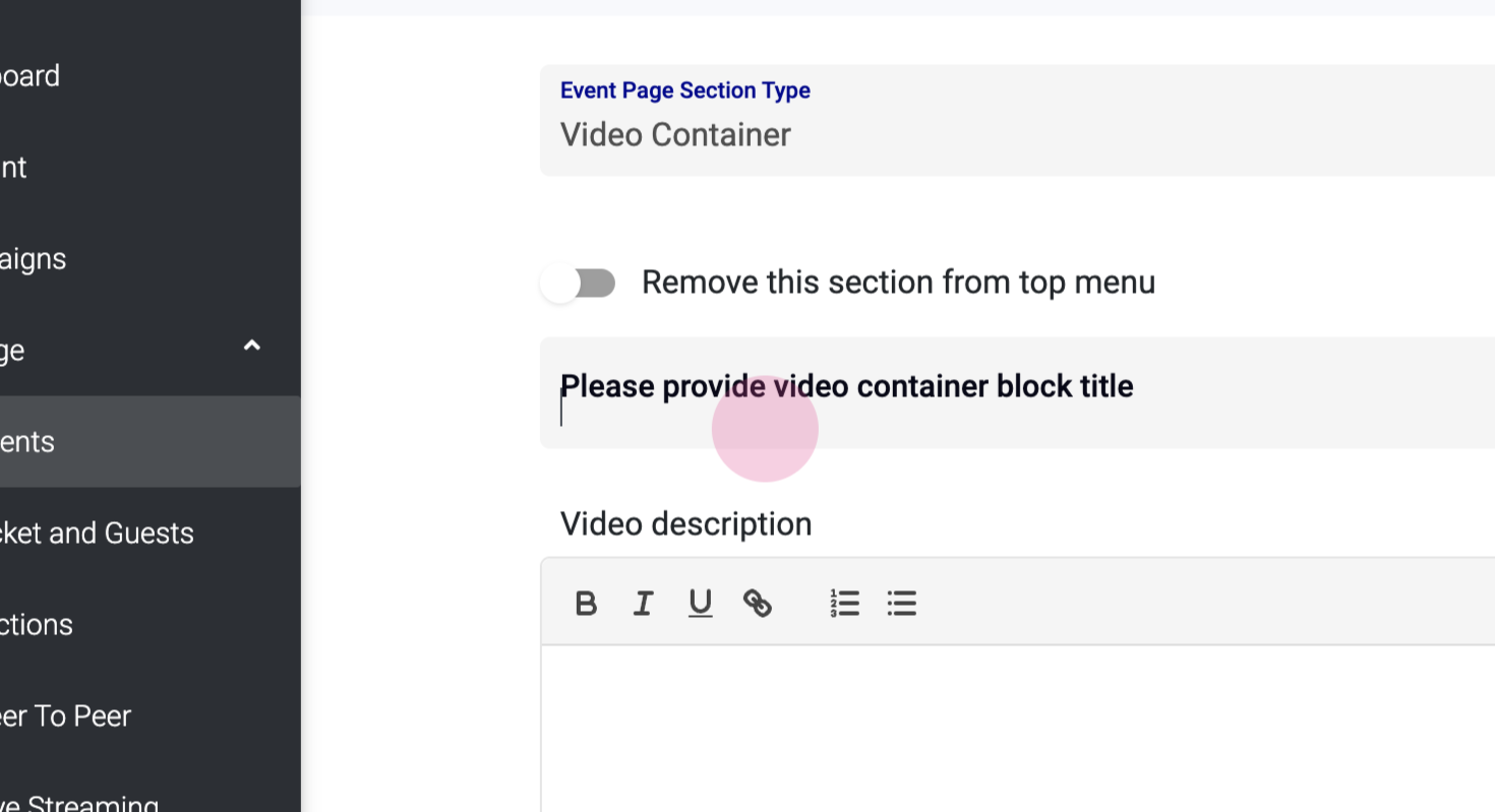 Next, click on 'Sections' and then 'Add a Section'. From the 'Event Page Section Type', select 'Video Container'.