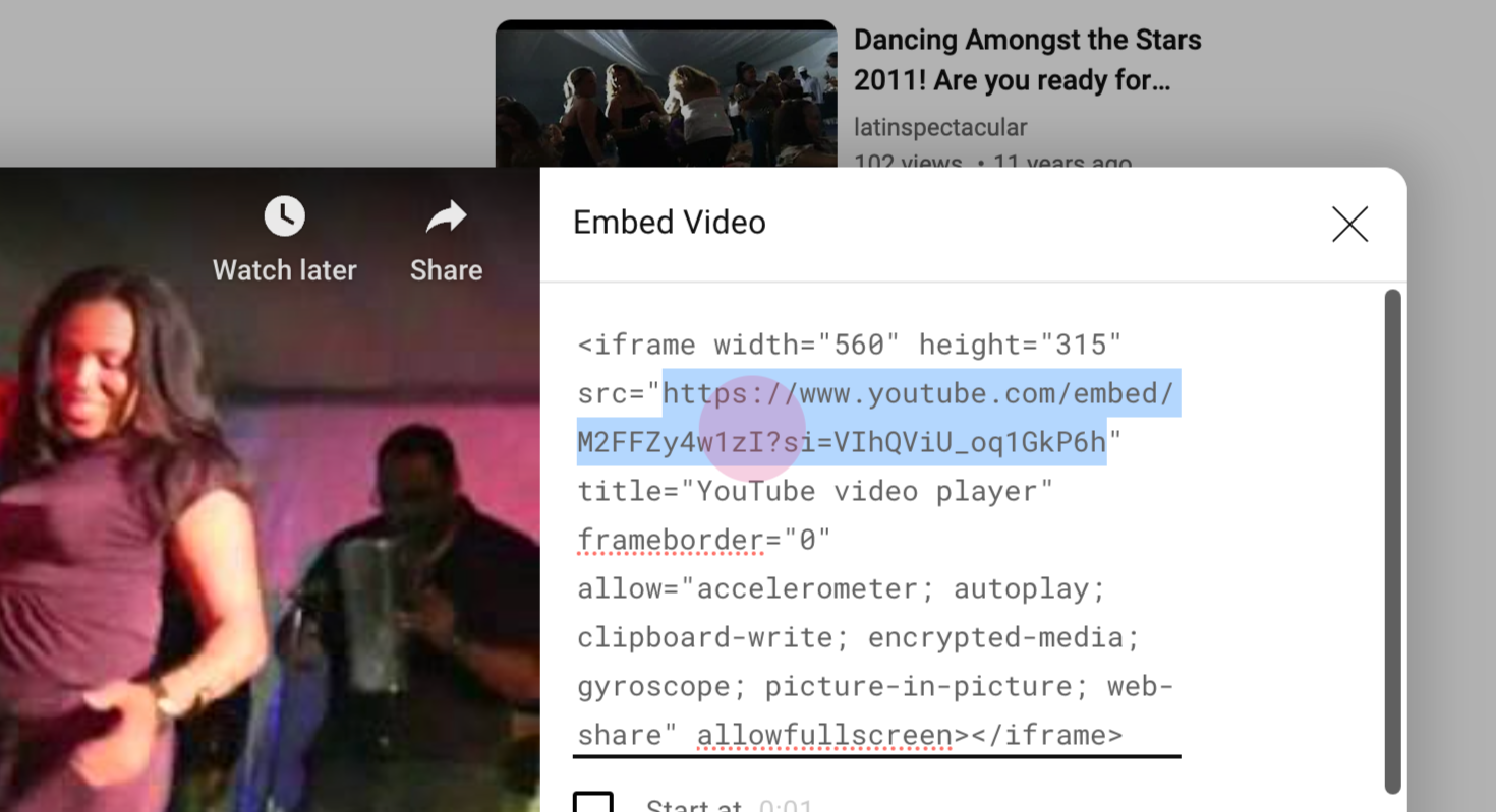To find the embed code for a YouTube video, click on 'Share' and then 'Embed'. The section within the quotation marks is what you need.