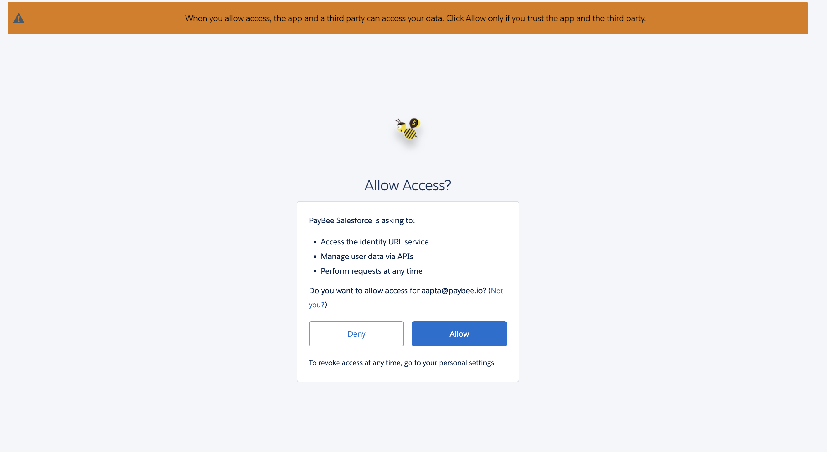 Connect PayBee with your Salesforce account. First, go to Salesforce and login. Then, allow PayBee to access to read and write into Salesforce. See an example of the access dialog below.