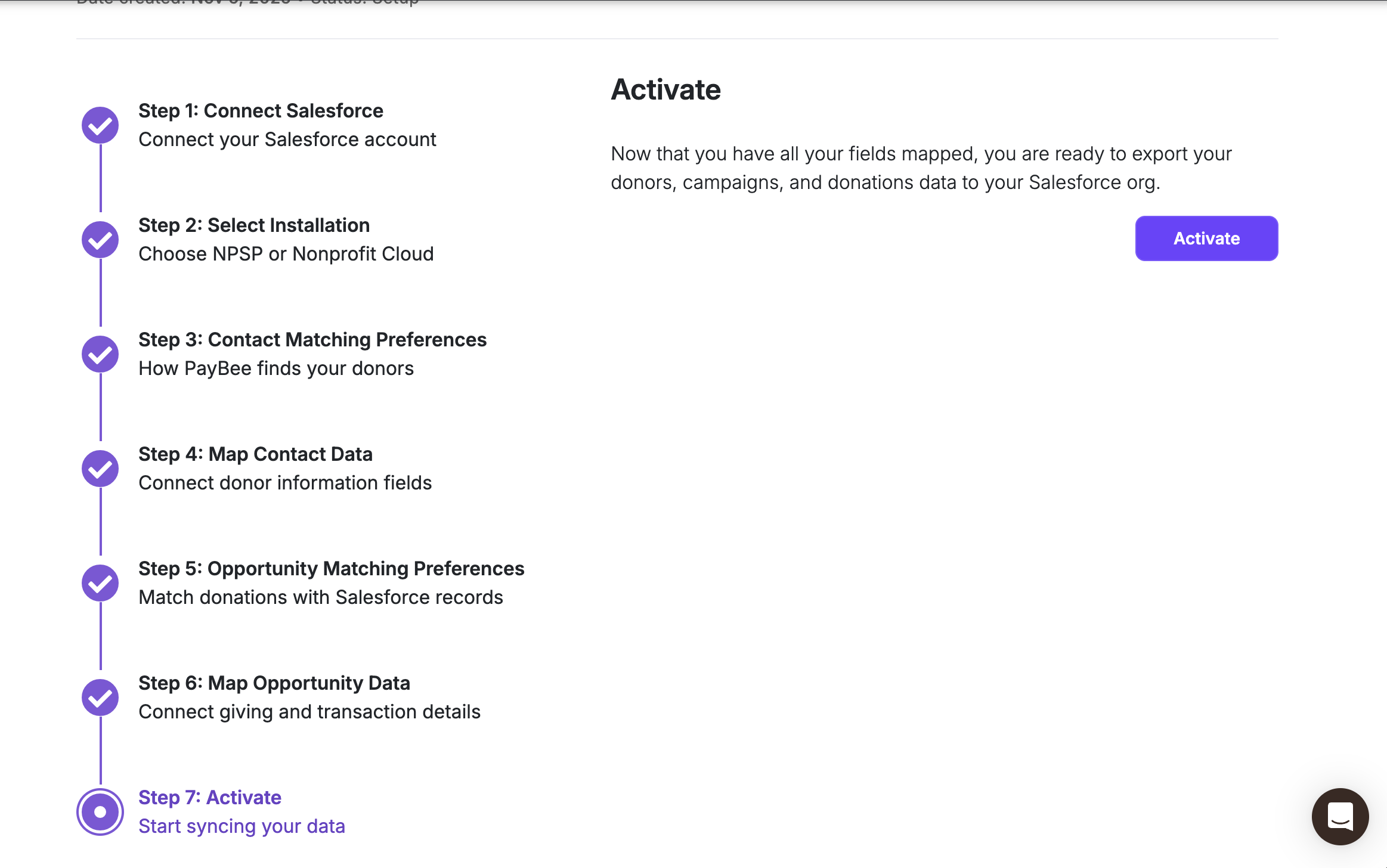 Finally, activate the integration to export all the donor and transaction data from PayBee into Salesforce.