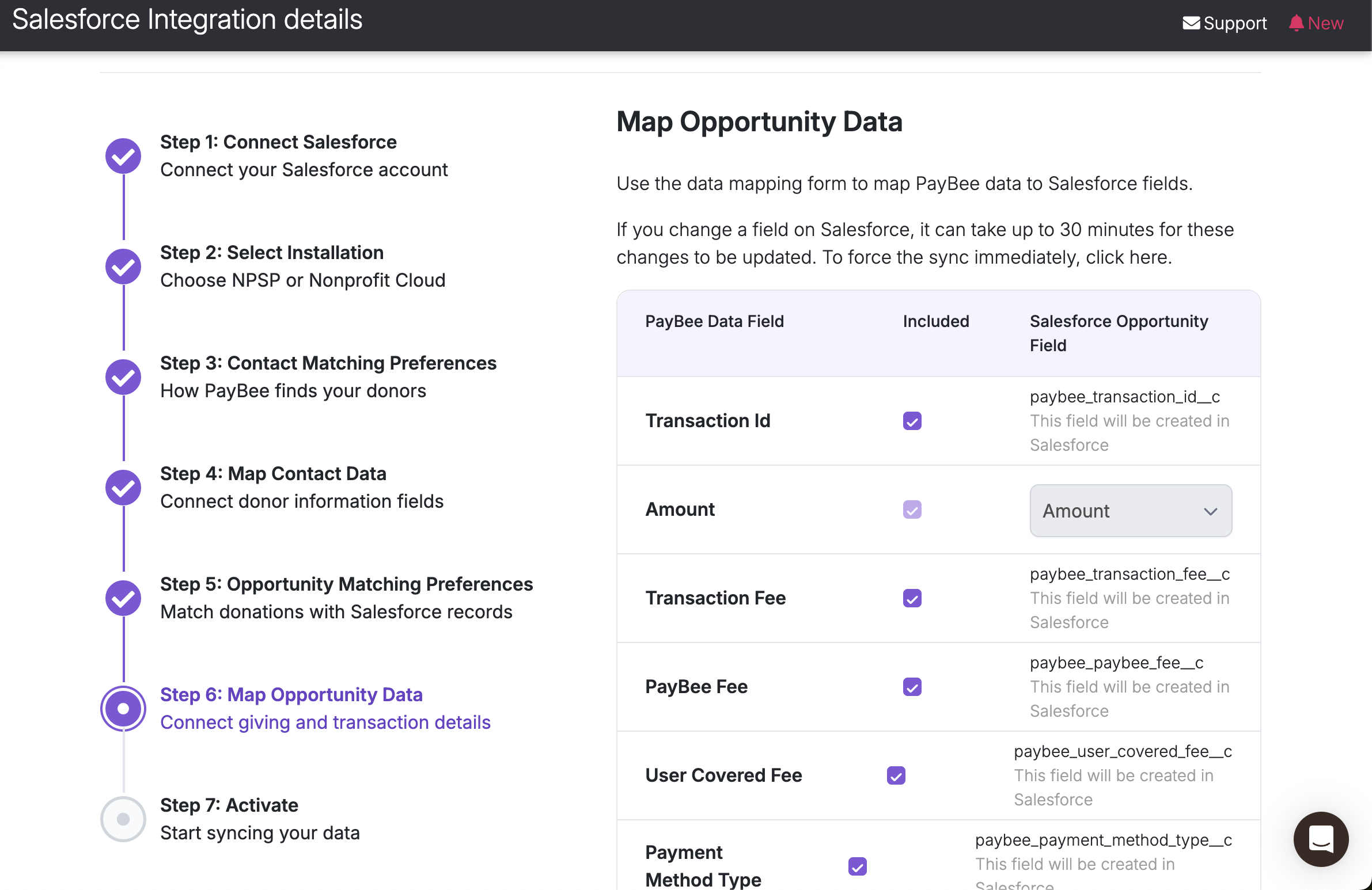 Now, map the the transaction data from PayBee into the Salesforce data fields using the form displayed on the screen.